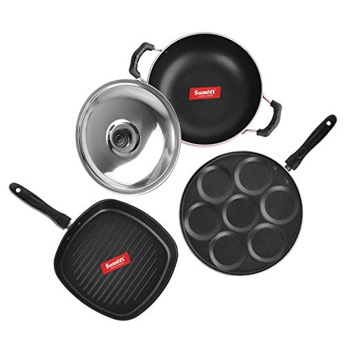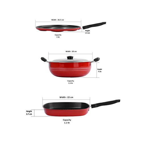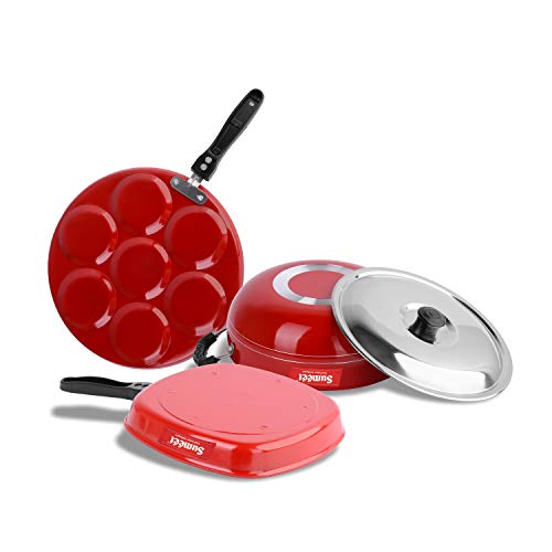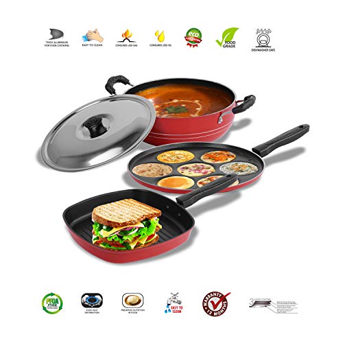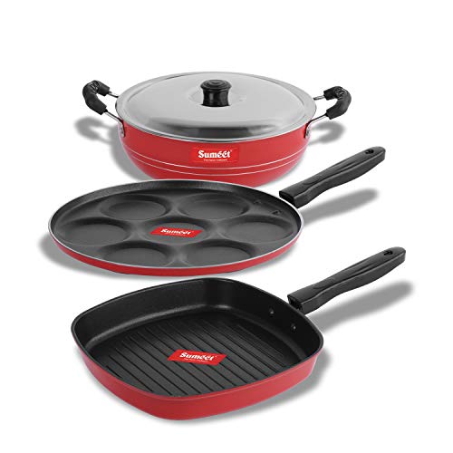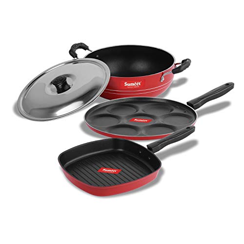 Sumeet 2.6mm Thick Non-Stick Go Red Combo Set (Multi Snack Maker – 26.5cm Dia + Kadhai with Lid – 1.5Ltr Capacity- 20cm Dia + Grill Pan – 1.1Ltr Capacity – 22cm Dia)