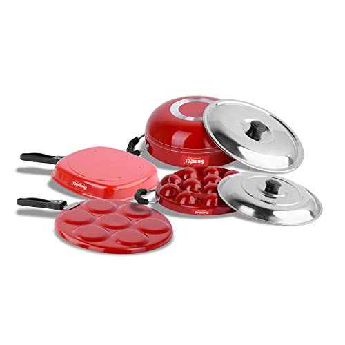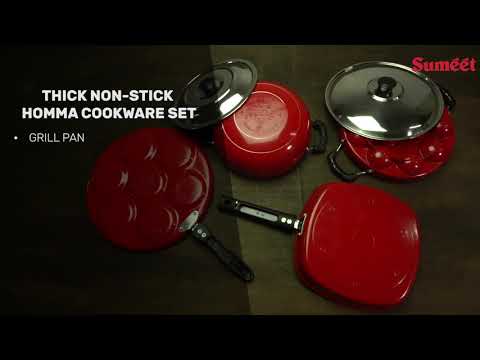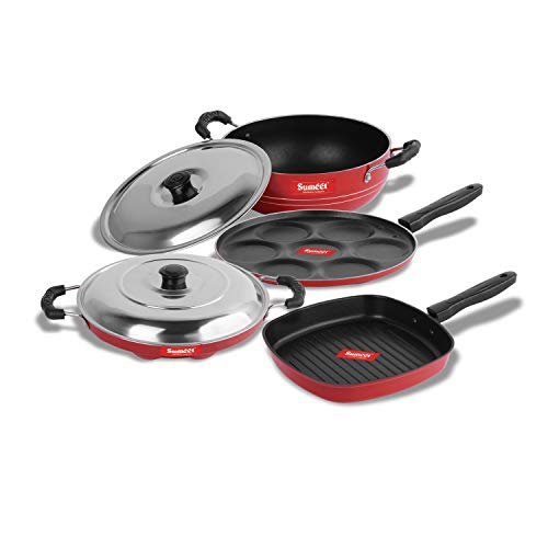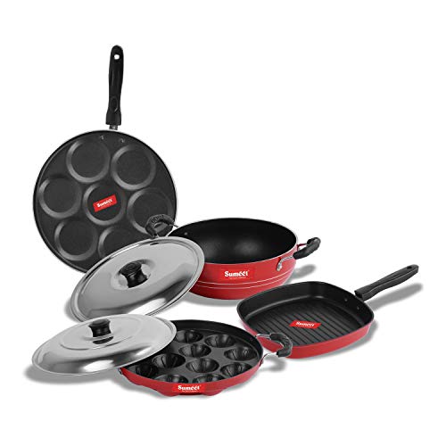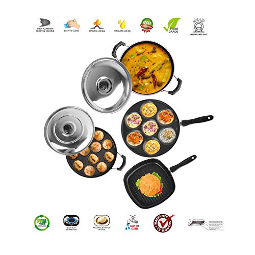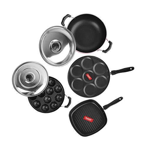 Sumeet 2.6mm Thick Non-Stick Homma Cookware Set (Multi Snack Maker – 26.5cm Dia + Kadhai with Lid – 1.5Ltr Capacity- 20cm Dia + Grill Appam Patra with Lid – 23cm Dia + Grill Pan – 1.1Ltr)