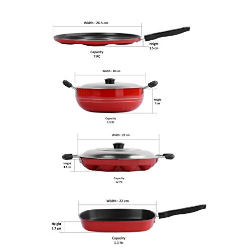 - Pack Contents: Grill Appam Patra: Dimension - L X W X H (cms): 23 X 23 X 3.7 ;Grill Pan:-Dimension - L X W X H (cms): 22 X 22 X 3.7; Capacity in Liters- 1.1ltr; Multi Snack Maker:-Dimension - L X W X H (cms): 26.5 X 26.5 X 1.5;Kadhai with lid:-Dimension - L X W X H (cms): 20 X 20 X 7;Capacity in Liters-1.5Ltr