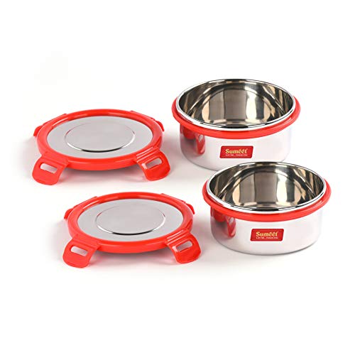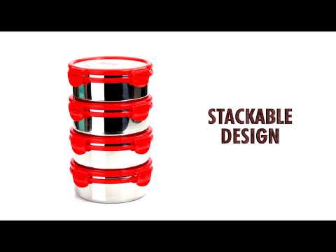 - Sturdy and smart, you are sure to adore these containers and its red color. Steel container comes with easy locking. Stainless steel container has Odor less Stainless-Steel lid cover with Food Grade Silicon Seal (Gasket) in Lid & has all 4 Sides Locks Which ensures 100% airtight containers for keeping food fresh, 100% leak proof containers, stackable design for easily storing and the pioneering clip mechanism. In this Airtight + Leak Proof Steel Containers