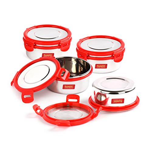 - Sturdy and smart, you are sure to adore these containers and its red color. Steel container comes with easy locking. Stainless steel container has Odor less Stainless-Steel lid cover with Food Grade Silicon Seal (Gasket) in Lid & has all 4 Sides Locks Which ensures 100% airtight containers for keeping food fresh, 100% leak proof containers, stackable design for easily storing and the pioneering clip mechanism. In this Airtight + Leak Proof Steel Containers