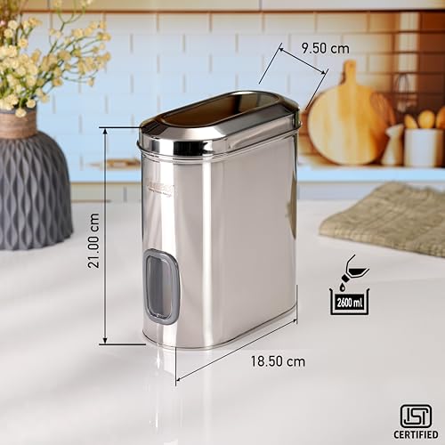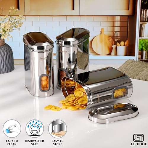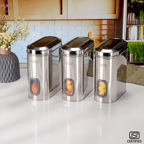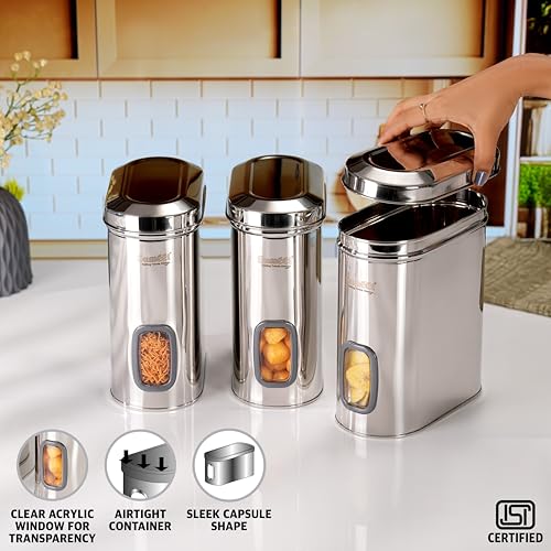 Sumeet ISI Certified Stainless Steel Capsul Canister/Container for Kitchen Storage with See Through Window - Set of 3 Pcs - 2600ml, Silver