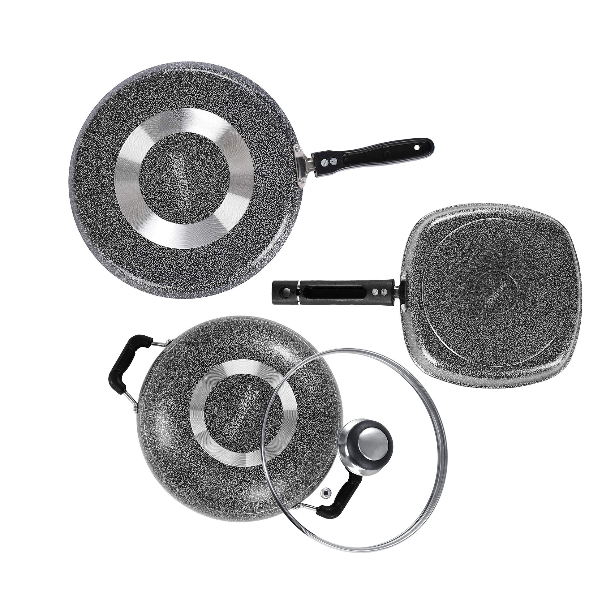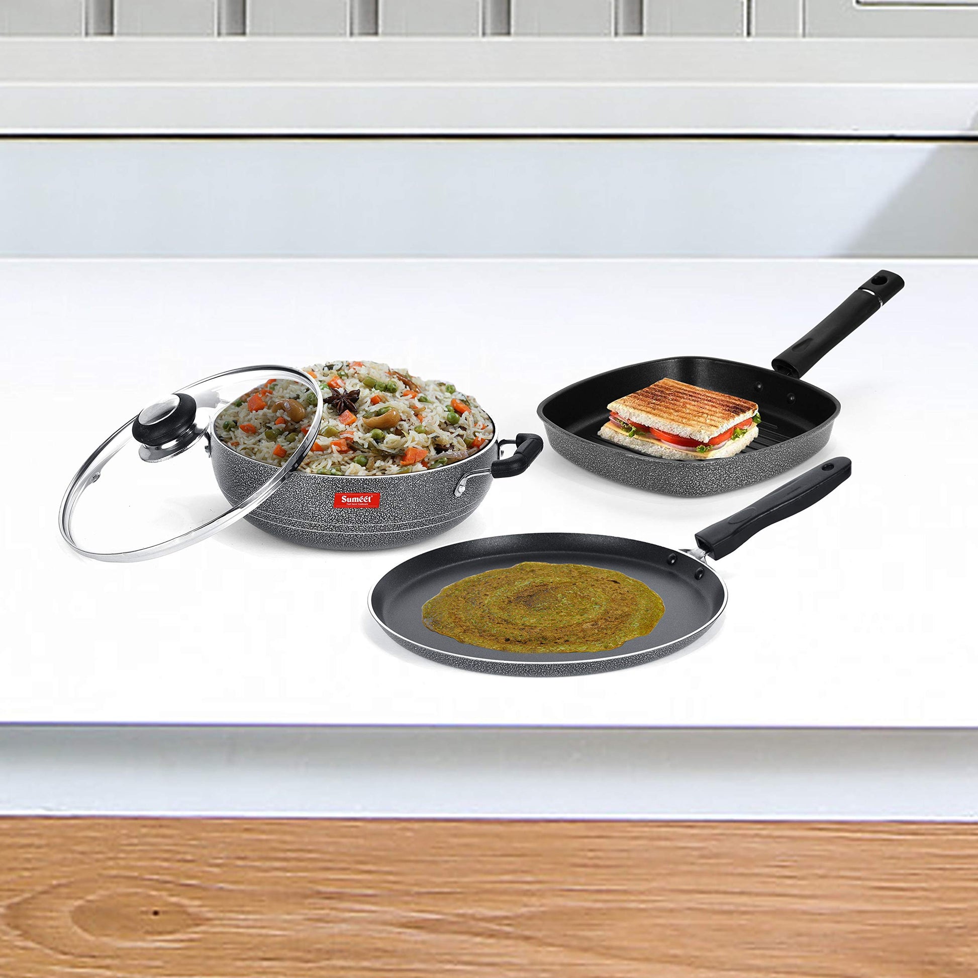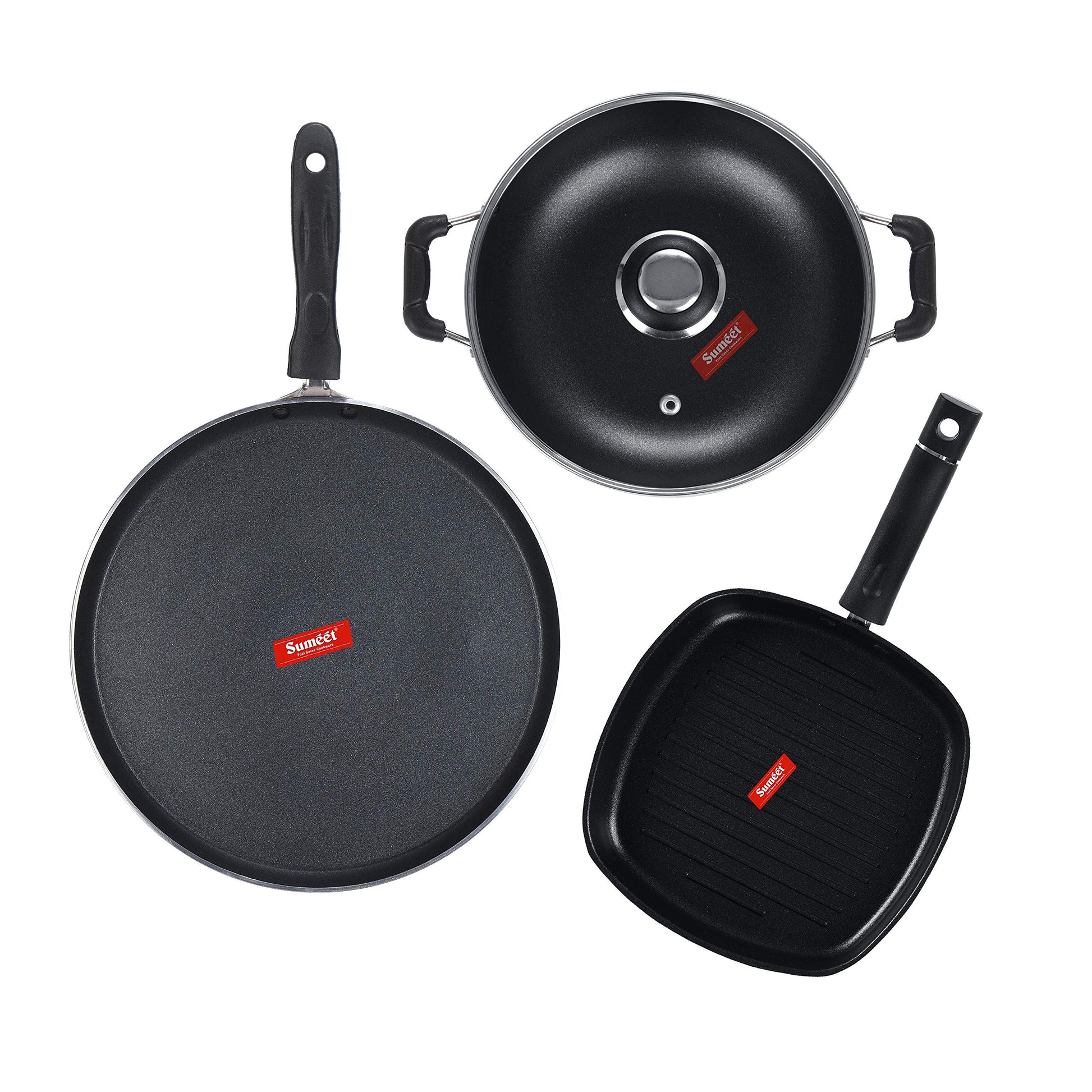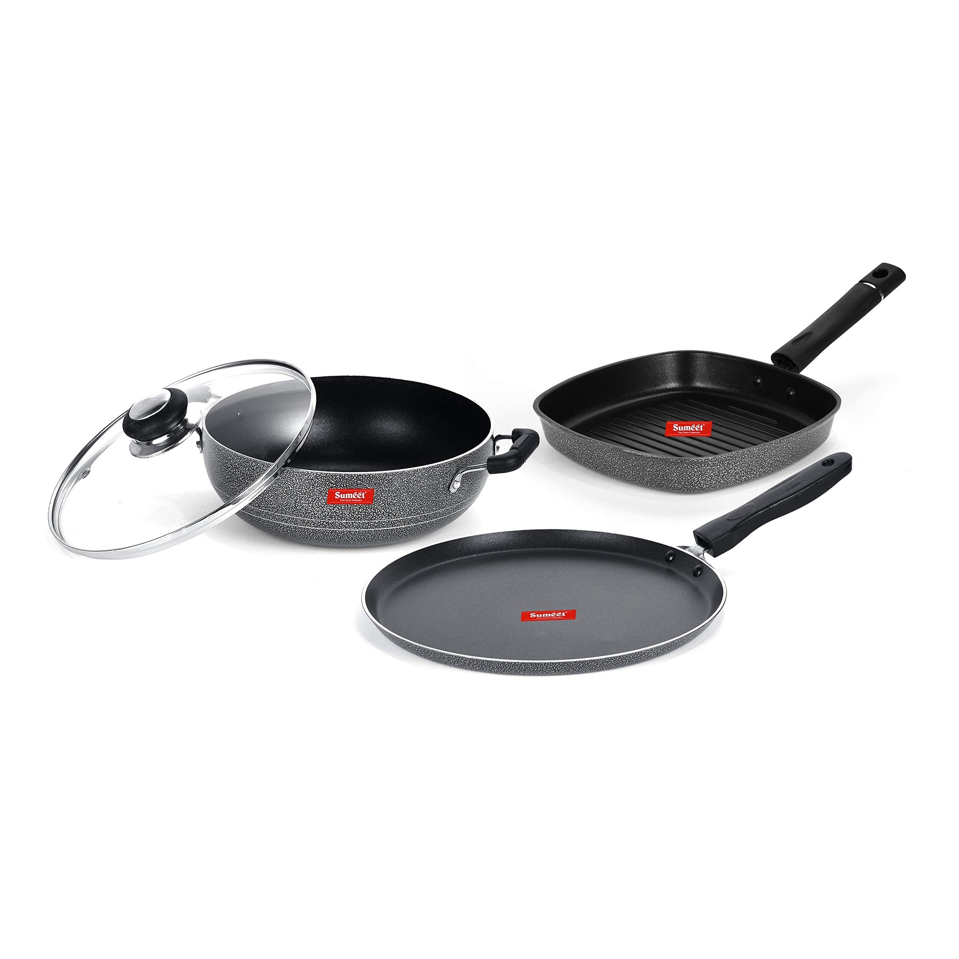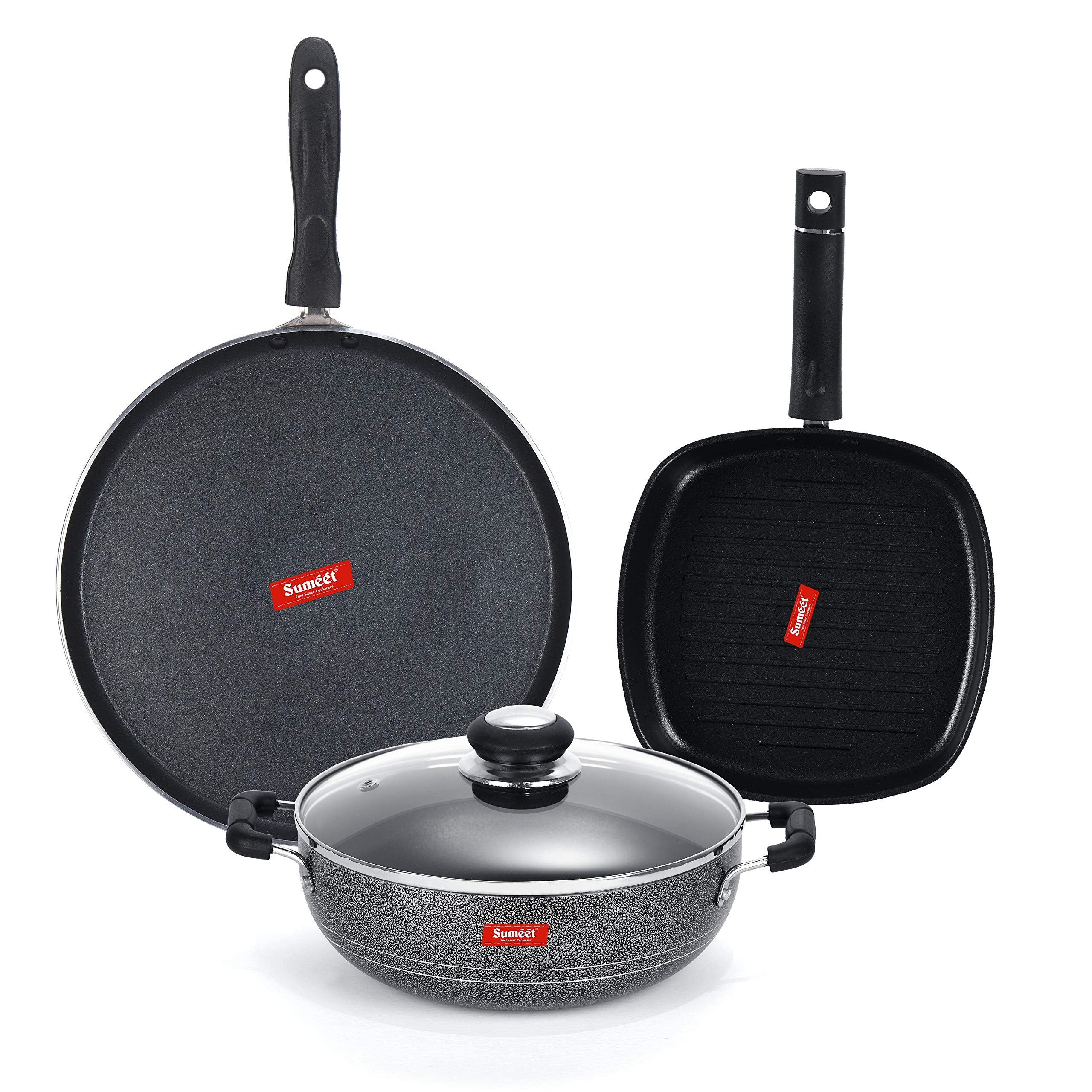 Sumeet NonStick Cawl Cookware Set (Dosa Tawa - 26.5Cm Dia + Kadhai with Glass Lid -2Ltr - 22Cm Dia + Grill Pan-22cm Dia)