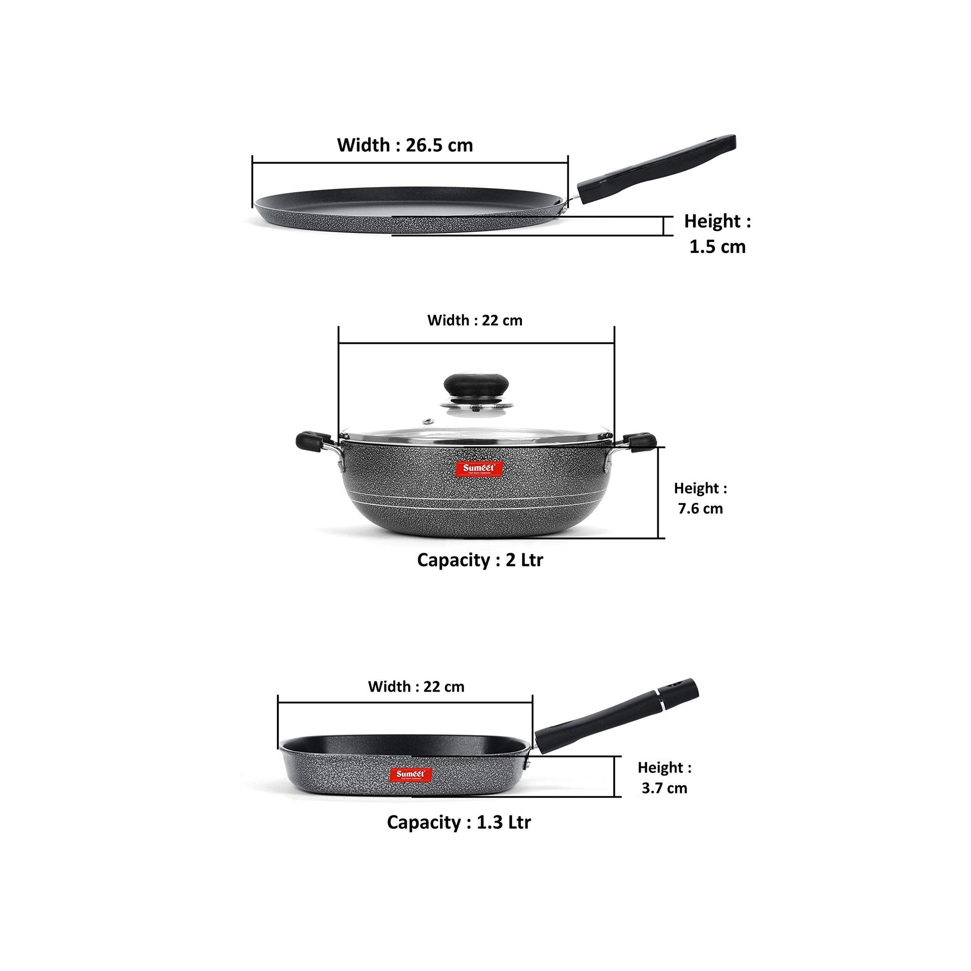 - Pack Contains - 1 Pc Dosa Tawa, DIMENSIONS: L x W x H(cm): 26.5 x 26.5 x 1.5 1 Pc Kadhai With Glass Lid, DIMENSIONS: L x W x H(cm): 22 x 22 x 7.6, Capacity: 2Ltr 1Pc Grill Pan, DIMENSIONS: L x W x H(cm): 22 x 22 x 3.7, Capacity: 1.3Ltr