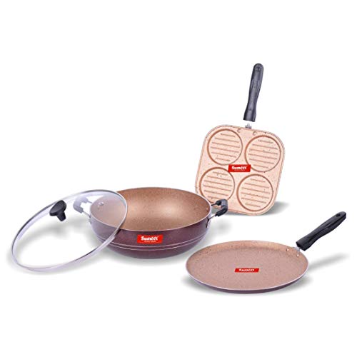 Sumeet Nonstick Granite Finish REVANTIO 3 pc Cookware Set (Mini Multi Snack Maker - 4 Cavity - 19.5cm Dia + Dosa Tawa - 26.5cm Dia + Kadhai with Glass Lid - 2.5 LTR Capacity - 24.5cm Dia)