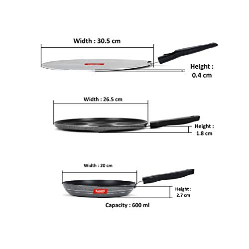 - Pack Contains - 1 Pc Flat Tawa, DIMENSIONS: L x W x H(cm): 30.5 x 30.5 x 0.4 1 Pc Multi Snack Maker, DIMENSIONS: L x W x H(cm): 26.5 x 26.5 x 1.8 1 Pc Tapper Pan, DIMENSIONS: L x W x H(cm): 20 x 20 x 2.7, Capacity: 600ml