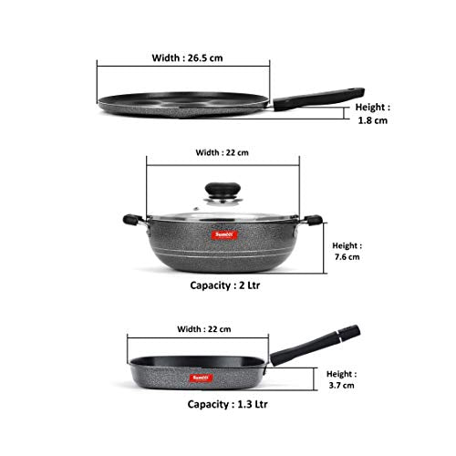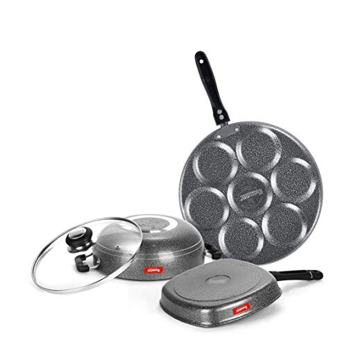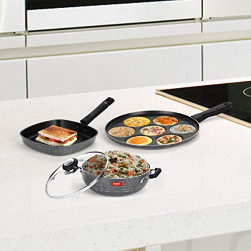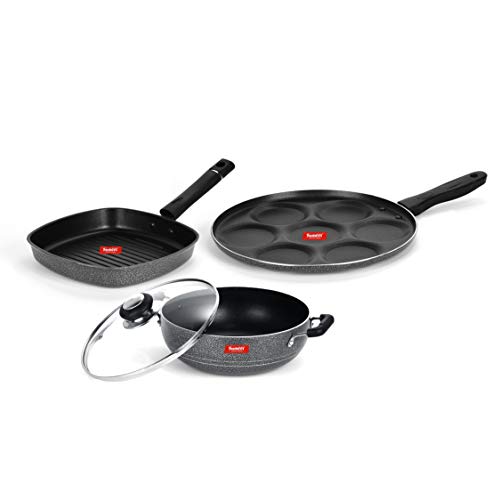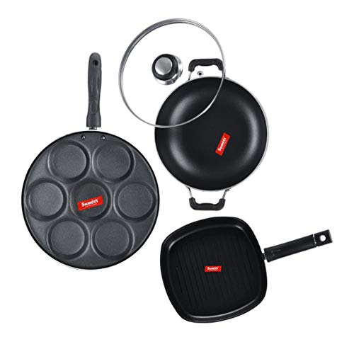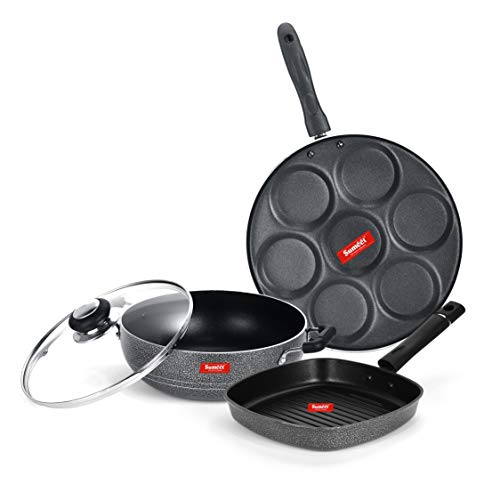 Sumeet NonStick Grigio Cookware Set (Multi Snack Maker - 7 Cavity - 26.5Cm Dia + Kadhai with Glass Lid -2Ltr - 22Cm Dia + Grill Pan-22cm Dia)