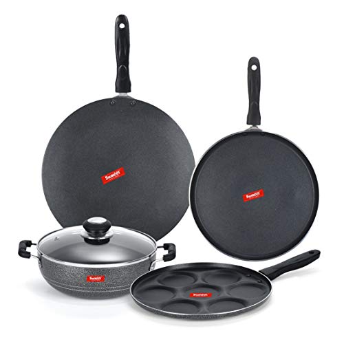 Sumeet NonStick Svartur Cookware Set (Dosa Tawa - 26.5Cm Dia + Multi Snack Maker - 7 Cavity - 26.5Cm Dia + Kadhai with Glass Lid -2Ltr - 22Cm Dia + Conceve/Roti Tawa - 28Cm Dia)