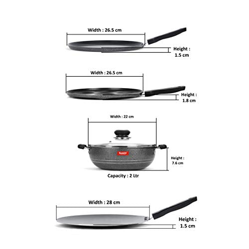 - Pack Contains - 1 Pc Dosa Tawa, DIMENSIONS: L x W x H(cm): 26.5 x 26.5 x 1.5 1 Pc Multi Snack Maker, DIMENSIONS: L x W x H(cm): 26.5 x 26.5 x 1.8 1 Pc Kadhai With Glass Lid, DIMENSIONS: L x W x H(cm): 22 x 22 x 7.6, Capacity: 2Ltr 1 Pc Concave Tawa, DIMENSIONS: L x W x H(cm): 28 x 28 x 1.5
