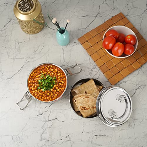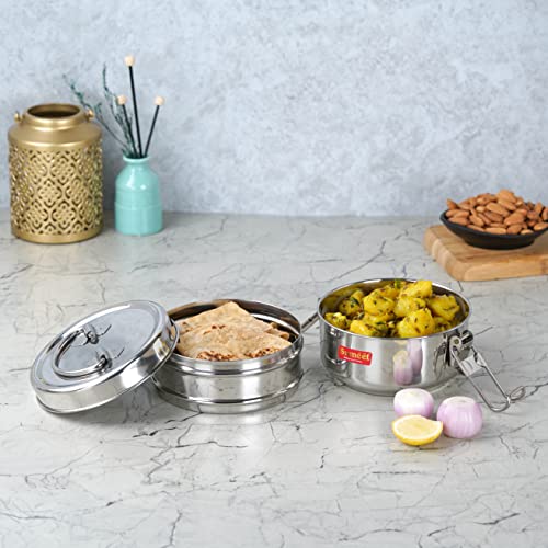 - This Stainless-Steel Round Tiffin comes with Flat and Sturdy base. This Clip Tiffin box is made from good quality food grade stainless steel, which makes it Durable and Strong.