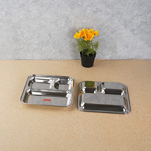 - Its unique mirror finish shine makes it ideal for your tableware. With features like elegance and durability, you can certainly rely on them for long-lasting utility. This season give your kitchen a perfect gift with Compartment Plates. It is very economical in range. It is non-breakable, durable, sturdy, rust free and long lasting.