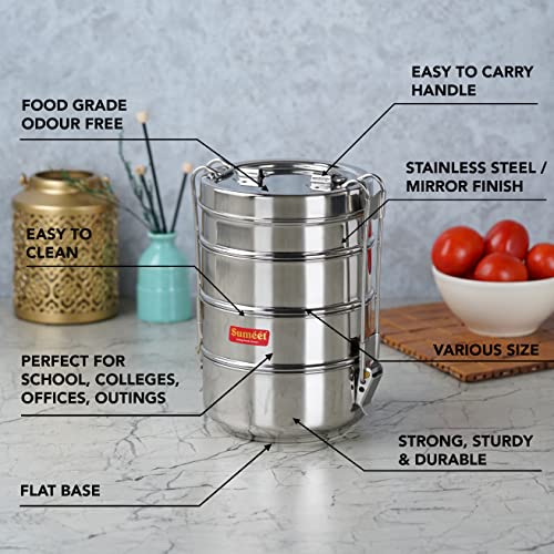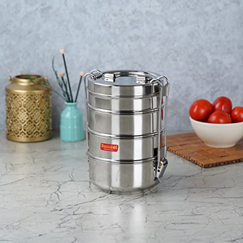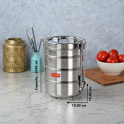 Sumeet Stainless Steel 4 Compartment Lunch Box / Tiffin with Lid and Handle, 13Cm Dia, (2550ML, Silver)