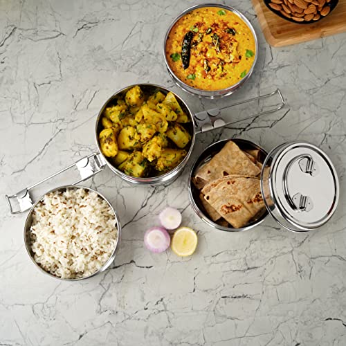 - This Stainless-Steel Round Tiffin comes with Flat and Sturdy base. This Clip Tiffin box is made from good quality food grade stainless steel, which makes it Durable and Strong.