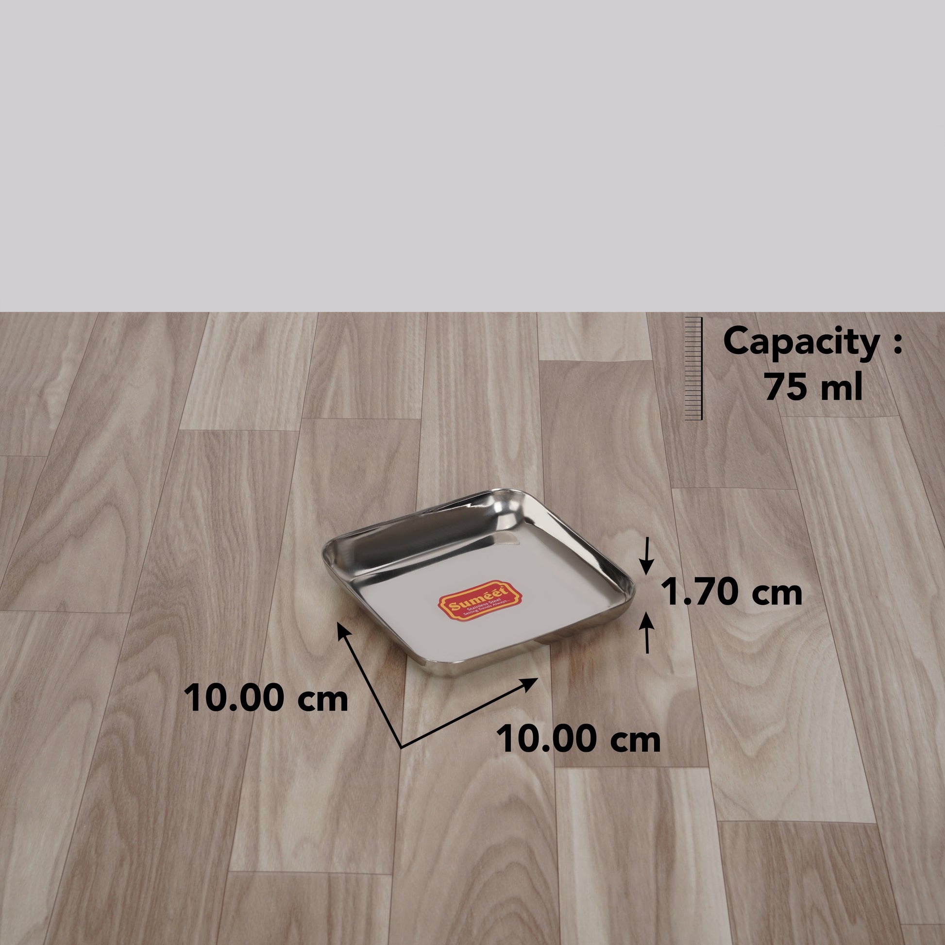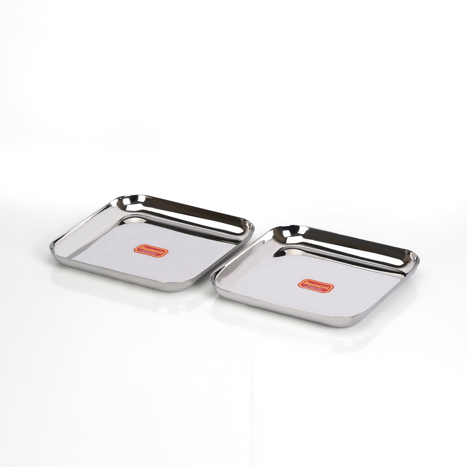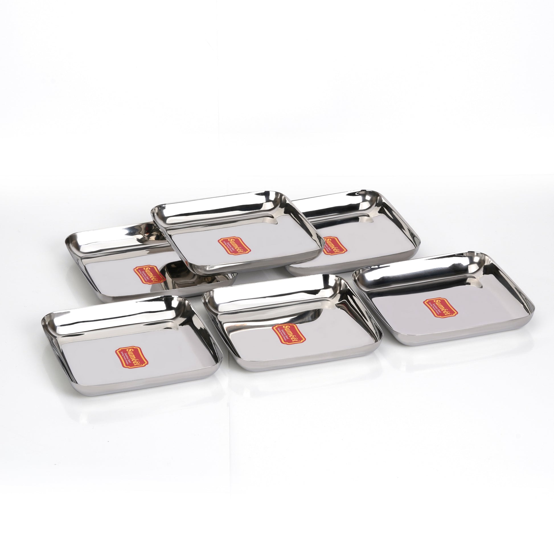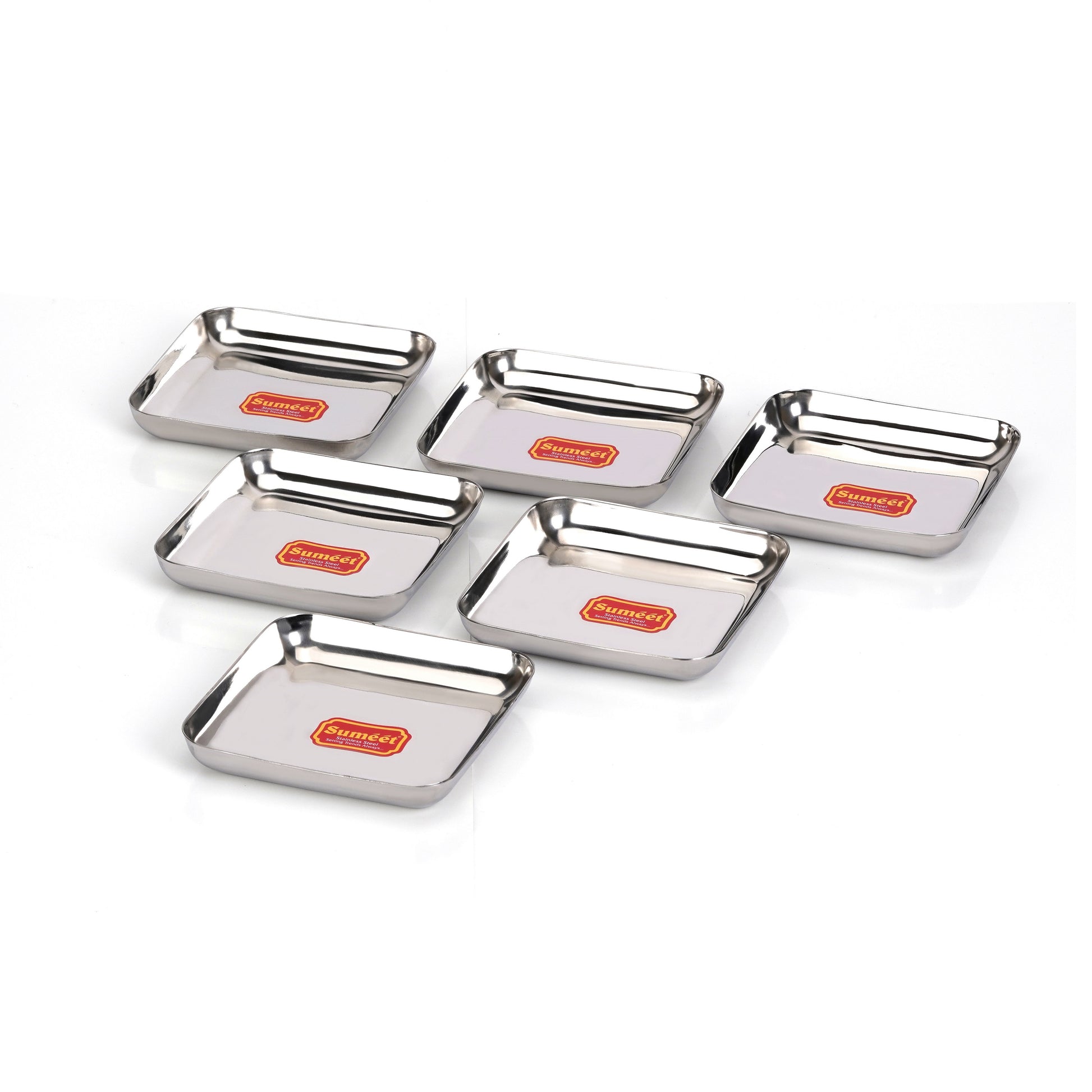 - To change the tradition of round plates Sumeet presents small square shape stainless-steel Dessert/ Halwa plate set which is food safe, durable, rust free and dishwasher friendly. This plate is crafted from Food Grade Premium Quality Stainless Steel material.
