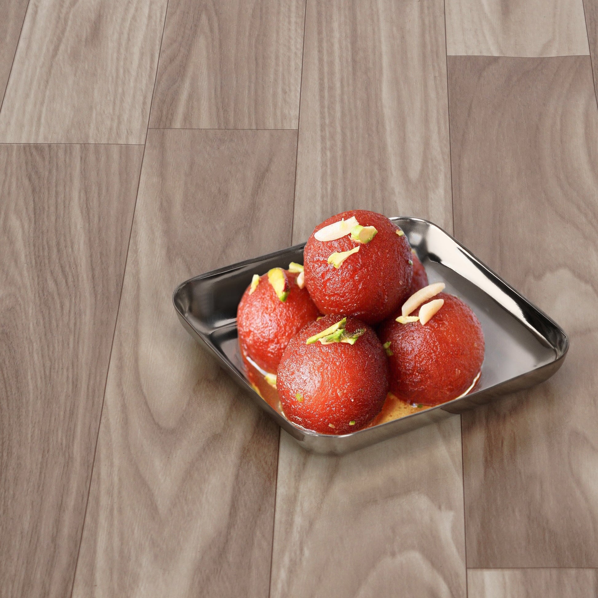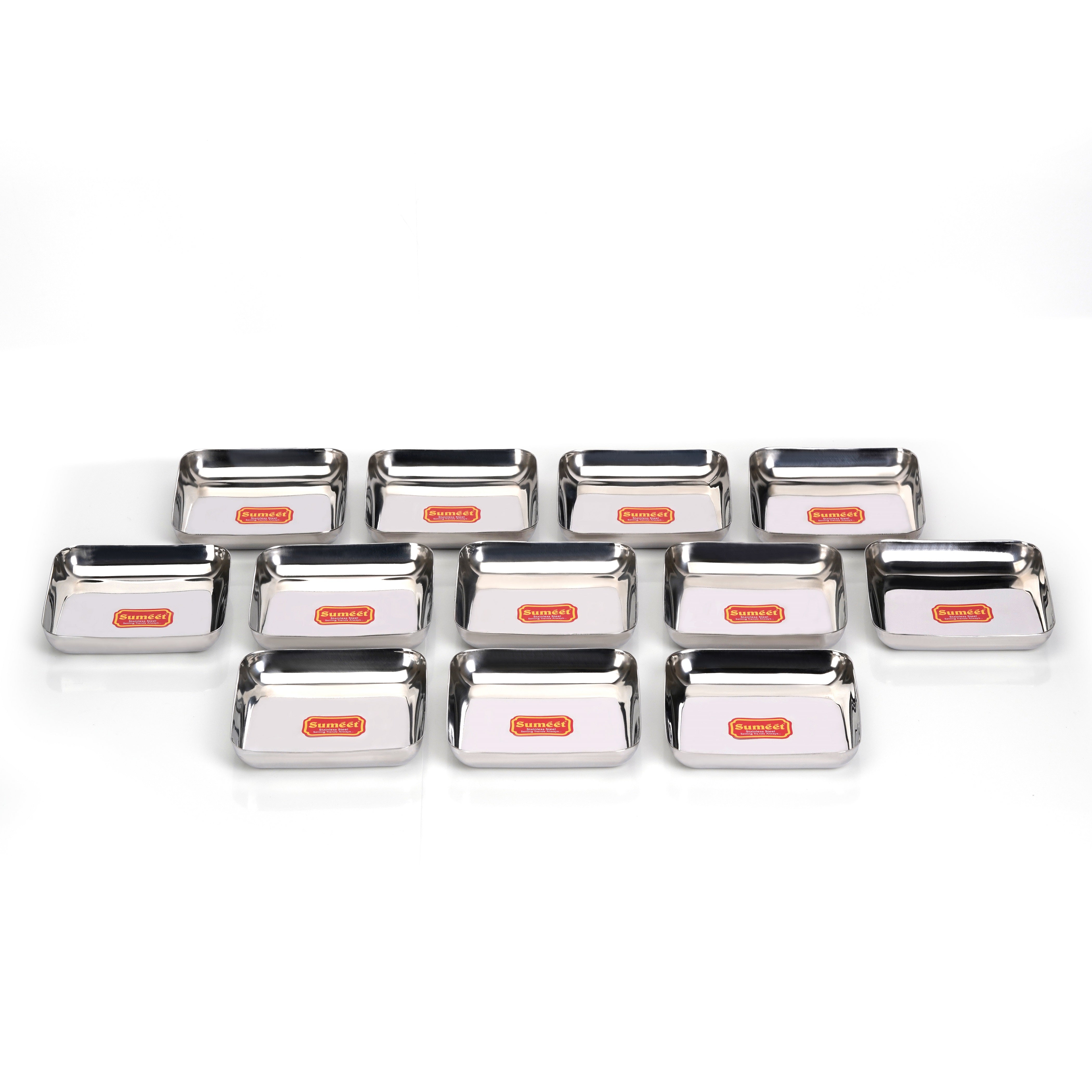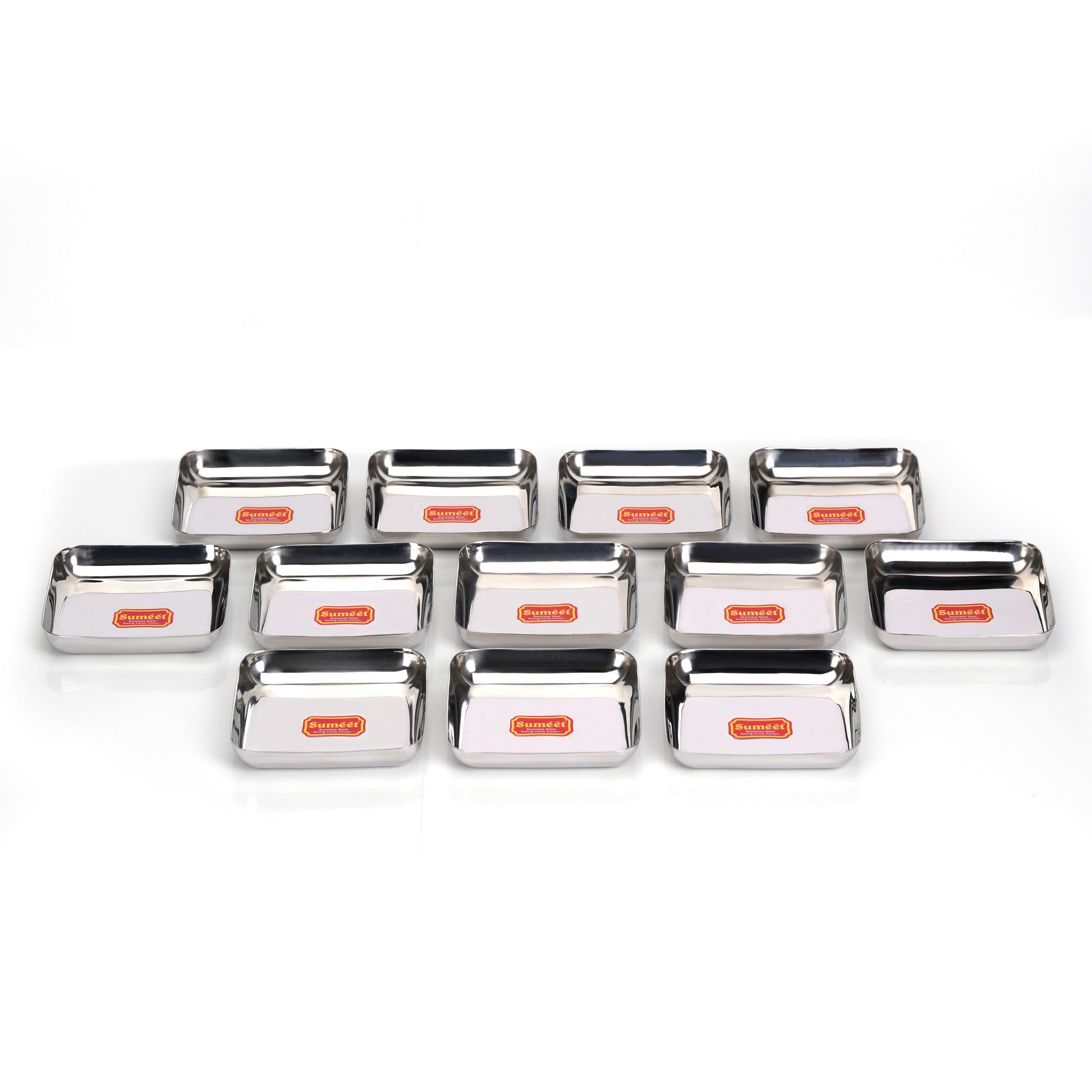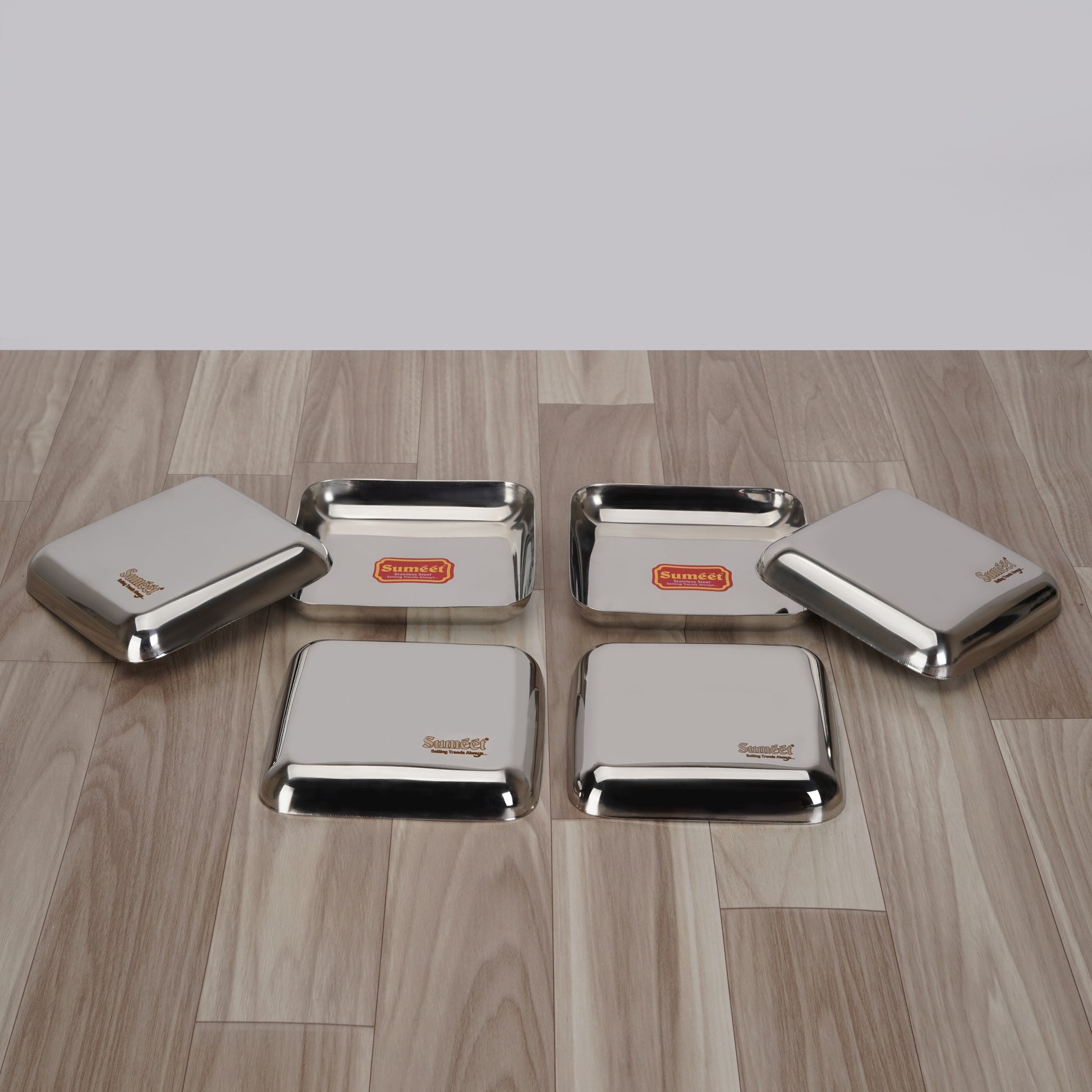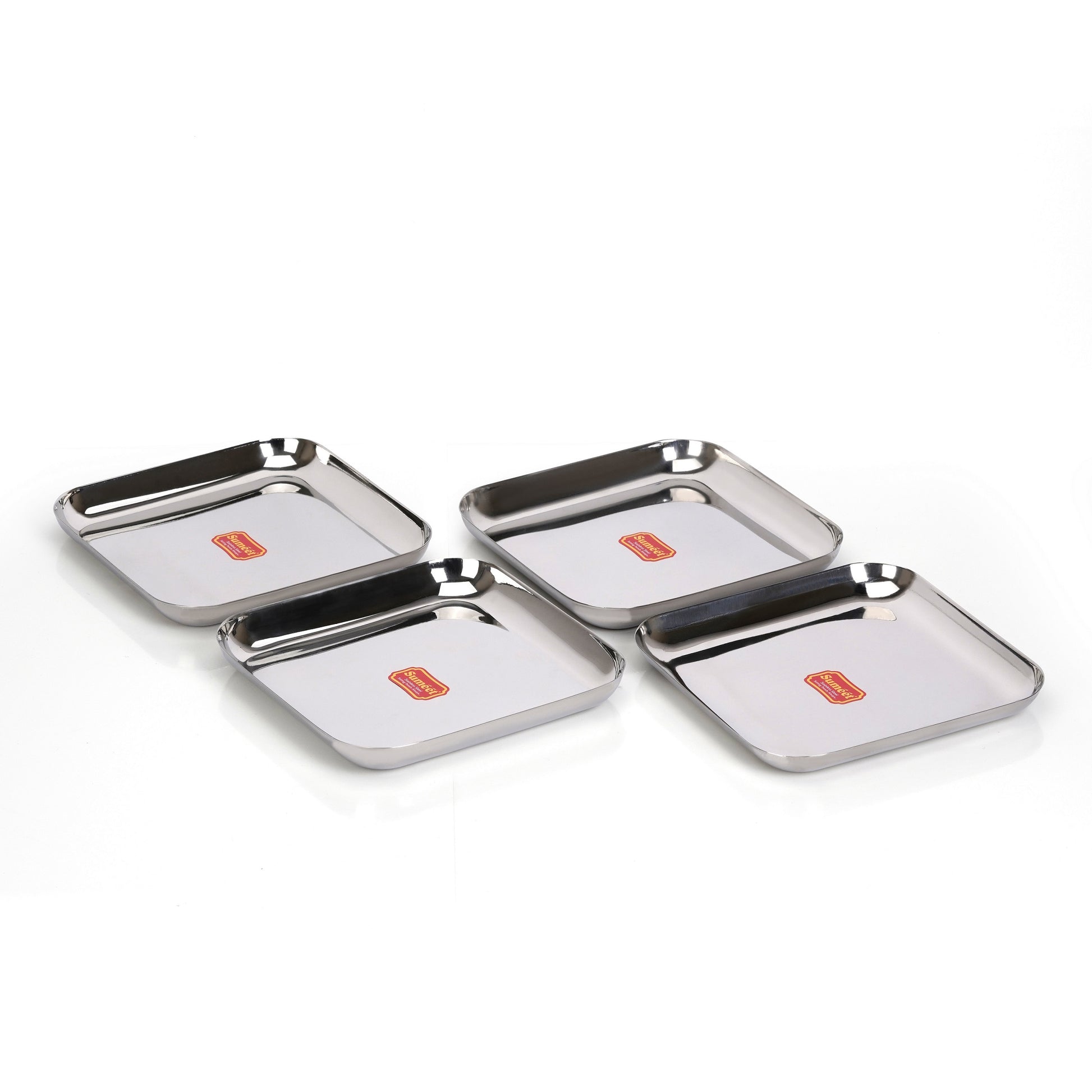 - To change the tradition of round plates Sumeet presents small square shape stainless-steel Dessert/ Halwa plate set which is food safe, durable, rust free and dishwasher friendly. This plate is crafted from Food Grade Premium Quality Stainless Steel material.