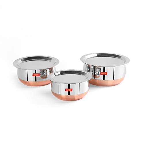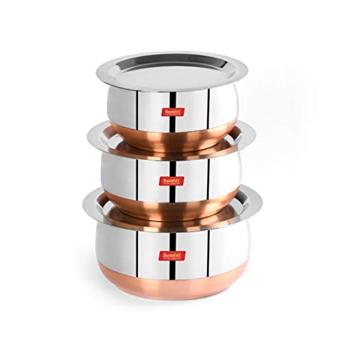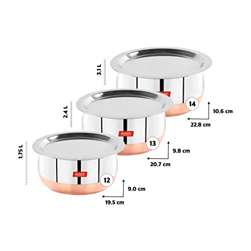 Sumeet Stainless Steel Copper Bottom Belly Shape 3 Pc Tope / Cookware/ Pot Set with Lid 1.75Ltr, 2.4Ltr, 3Ltr (Silver)