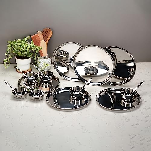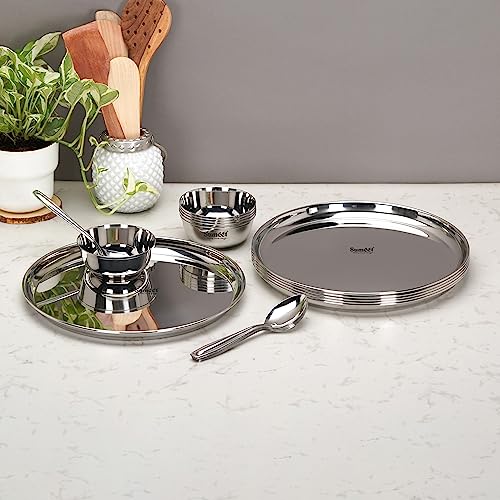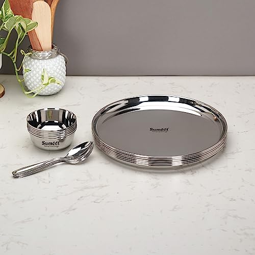 Sumeet Stainless Steel Heavy Gauge Mirror Finish Dinner Set of 18 Pcs (6 Plate, 6 Bowl/Wati, 6 Spoon), Silver