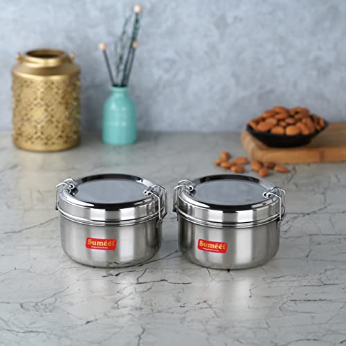Sumeet Stainless Steel Meal Pack Lunch Box / Tiffin with Steel Separator Plate and Locking Clip, Set of 2Pc, 300ML Each, 11.5cm Dia, Silver