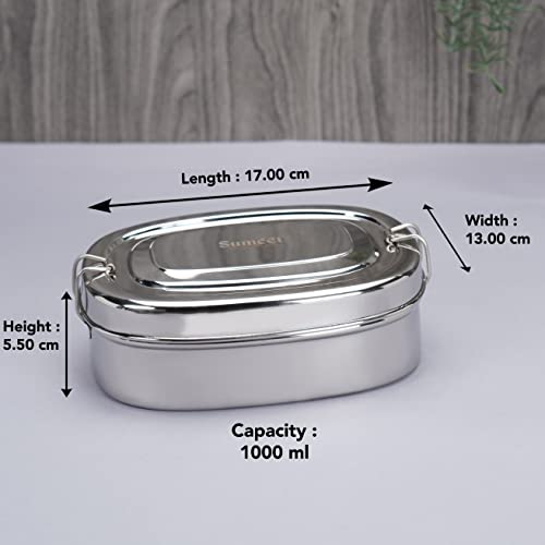 Sumeet Stainless Steel Rectangle Lunch Box/Tiffinwith 2 Compartments and Locking Clip, 1000ML, Ideal for 2 Person - Silver