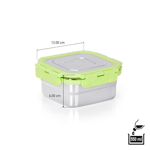 Sumeet Stainless Steel Square Shape Airtight Lock & Leak Proof Container/Lunch Box with Steel Lid - 550Ml, Pack of 2, Silver